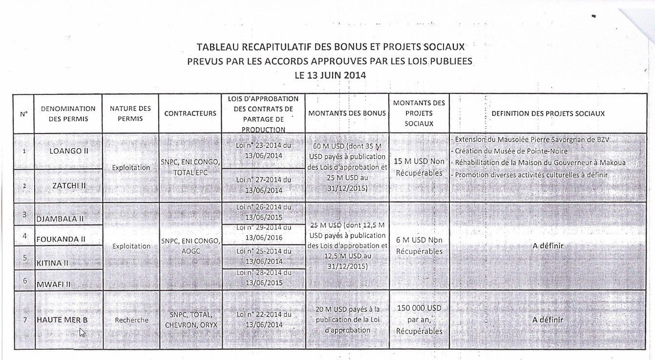 Dans les documents qui nous ont été transmis par un Honorable Député, un vrai, figure un « tableau récapitulatif des bonus et projets sociaux prévus par les accords approuvés par les lois publiées le 13 juin 2014 ». Pour rappel, les « bonus » sont des contreparties financières liés à l’attribution d’un permis d’exploration et de production. Ce sont des sommes relativement importantes. Dans le cas présent, il s’agit de 60, 25 et 20 millions de US dollars (30, 12,5 et 10 milliards de FCFA) qui ont été « officiellement déclarés ». Alors, lorsque l’on apprend que des projets sociaux sont liés à des « avantages pétroliers exceptionnels » on s’imagine immédiatement que les secteurs de la santé, de l’éducation et de la réduction de la pauvreté pourraient immédiatement en profiter.