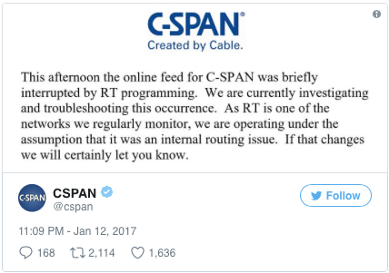 Quelques semaines plus tard, C-SPAN fit la une lorsqu’elle annonça que ses réseaux avaient été « interrompus par programmation Russia Today » :