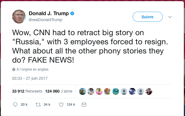 Et cet épisode fait suite à un correctif embarrassant que CNN fut forcée d’émettre plus tôt ce mois-ci après que plusieurs de ses présentateurs vedettes affirmèrent, de sources anonymes, que James Comey, dans sa déclaration devant le Congrès, allait réfuter l’allégation de Trump selon laquelle le directeur du FBI lui assura qu’il n’était la cible d’aucune enquête.